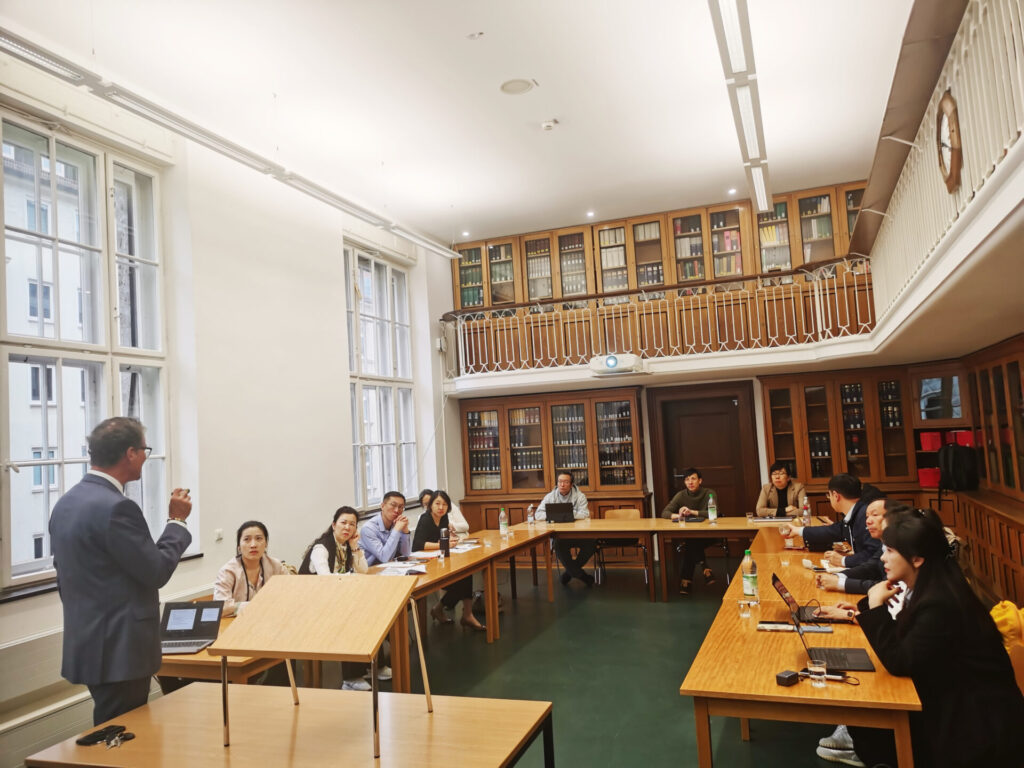 - 医疗领域专项学习:上午,代表团在拜仁州经济促进中心(Bayer Wirtschaft Haus)开启 “医院医疗行业创新与成果转化” 专题研修。德国著名医药专家 Prof. Gerald Huber, Ph.D. 与 Prof. Dr. Christian Franken 结合德国医疗体系政策,从 “技术研发 – 临床验证 – 市场转化” 全链条,为成员讲解医疗技术成果转化的关键节点与风险管控方法;同时分享医院创新机制建设的实操经验,以及国际合作中技术对接的研修要点。二人还以自身创业的 3D 打印药品公司为例,让成员直观了解医疗技术从实验室走向市场的落地路径。